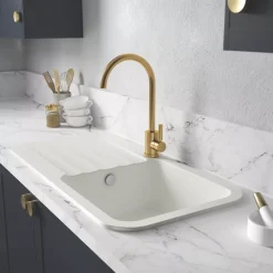 Natural granite style. Features rounded corners with stylish, practical bowl styling and drainer area. Brushed metal overflow. Blends easily into any kitchen decor. Supplied with Orbit waste and pipework.