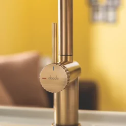 Contemporary design with a 90° angled swivel spout. Includes a cold start valve that prevents unnecessary hot water usage. Antique brass finish.