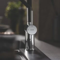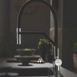 Features pull-out spout with spray feature and neat, mag-snap bracket. Ceramic disc technology ensures effortless water control. Contemporary design.