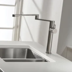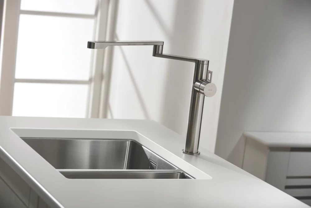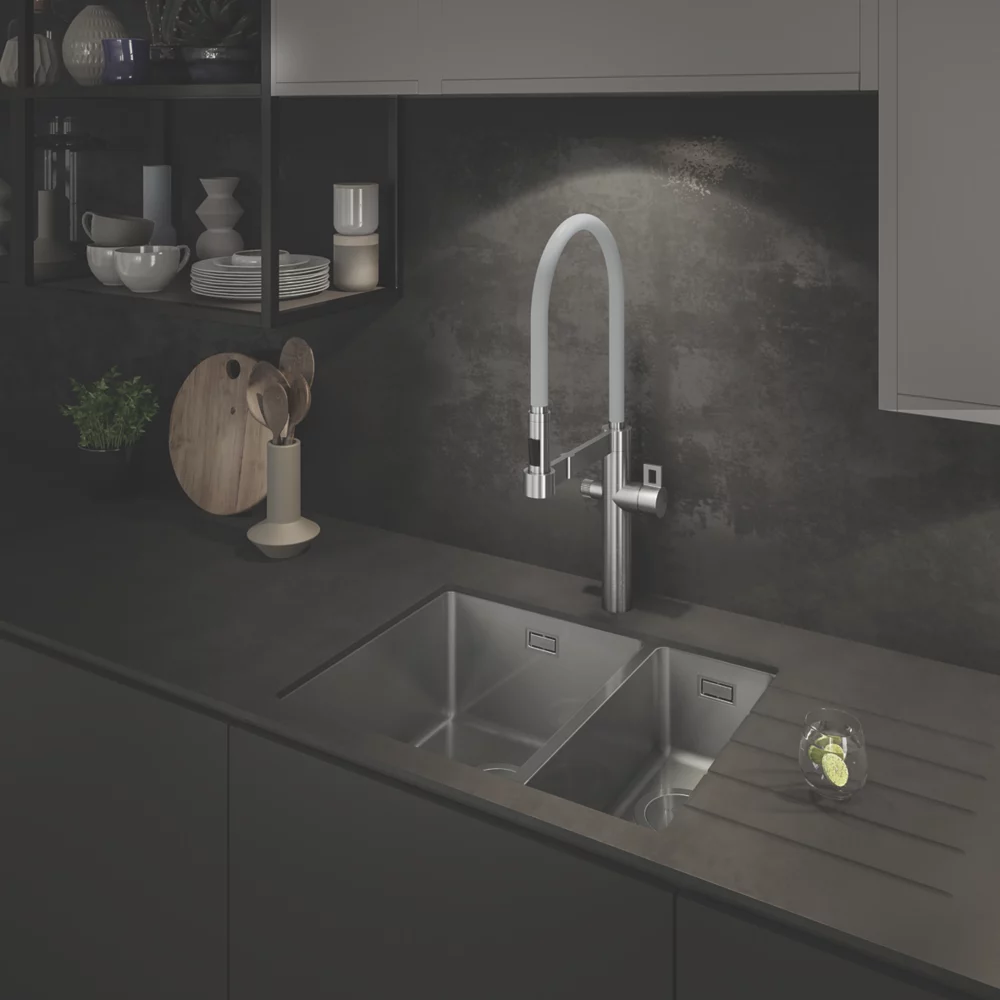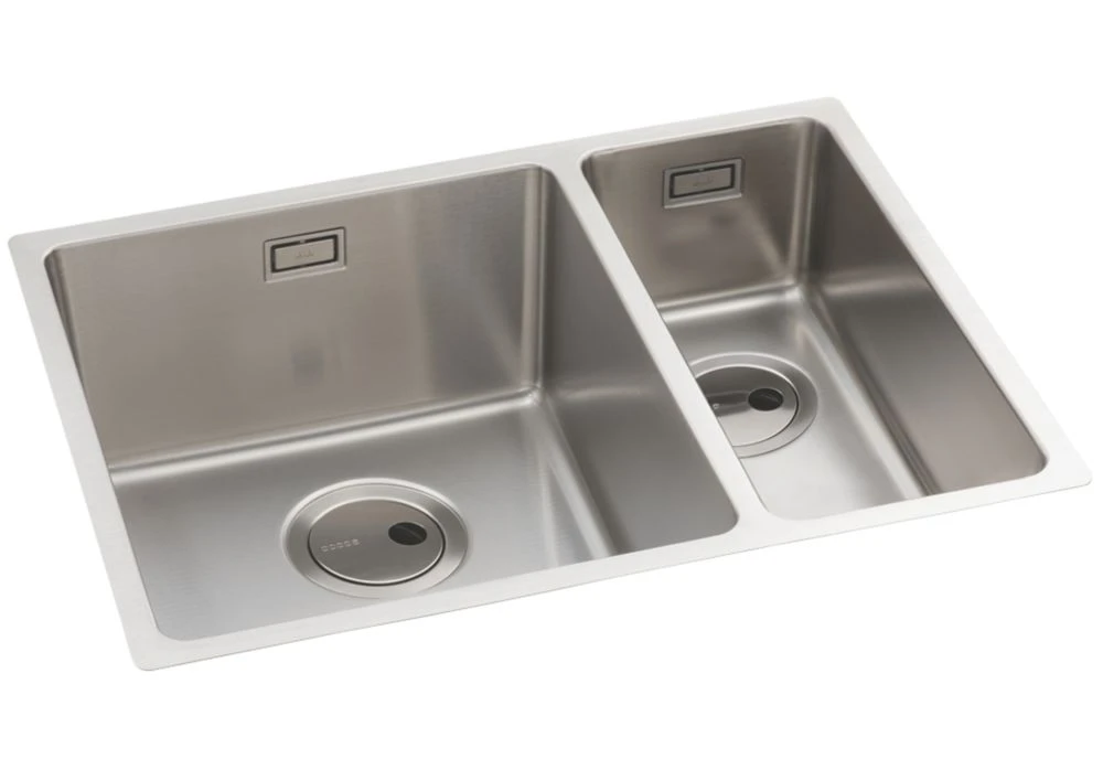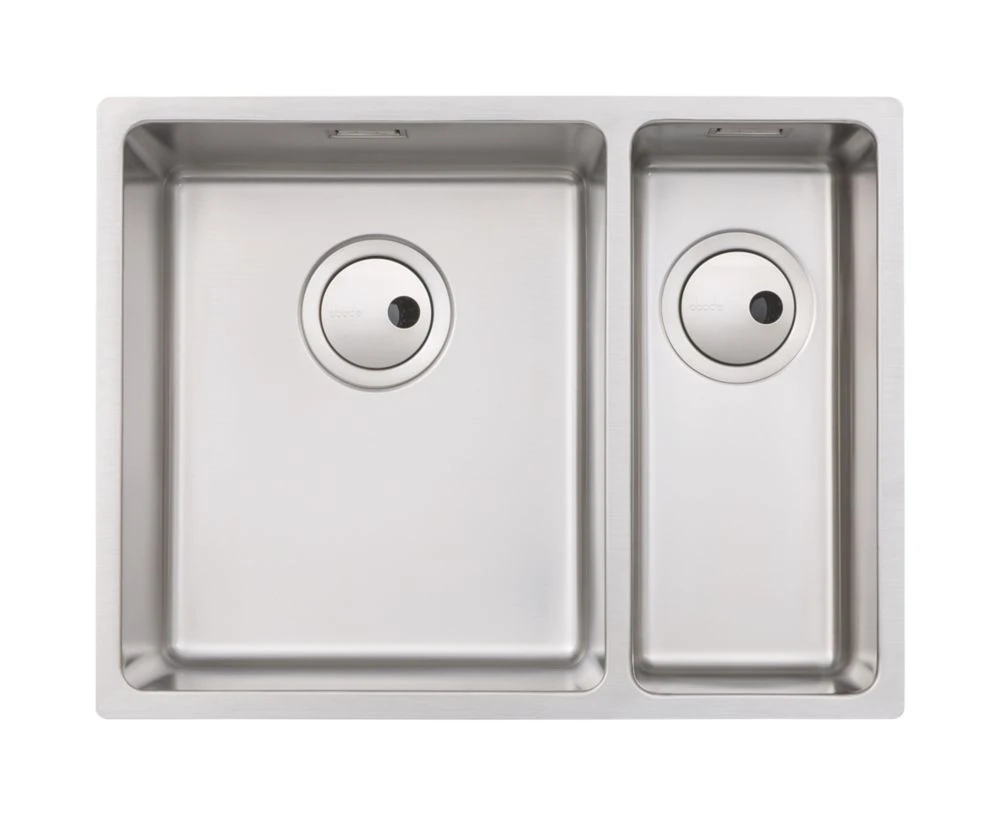 Sleek and modern, easy-clean 1.5-bowl sink with close-to-square corners. Offers option of undermounted or low profile inset installation. Features flush plate overflow and practical Orbit waste.