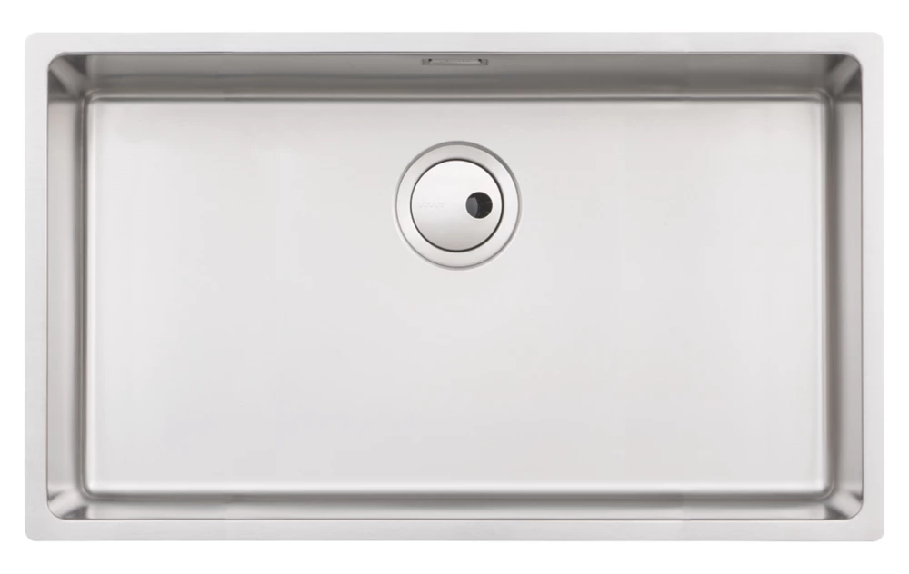 Sleek and modern, easy-clean single bowl sink with close-to-square corners. Offers option of undermounted or low profile inset installation. Features flush plate overflow and practical Orbit waste.