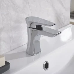 Dual-handle set up with ceramic quarter turn valves. Quad spout registers lower in height than typical swan spouts, so it can be more suitable when specified under shelving or wall cabinets.