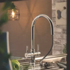 Modern design with a discreet, hidden pull-out hose. Hose is located at the back of the spout. Dual, long handle design with ceramic disc technology for effortless operation. Not supplied with a spray function.