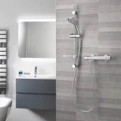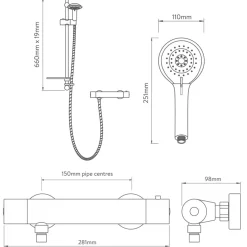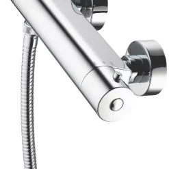 Stylish, modern brass valve with polished chrome finish and metal handles. Features cool touch body and a temperature override button. 3-mode 110mm handset for variable spray patterns. Supplied with 1.5m metal hose.