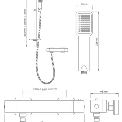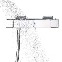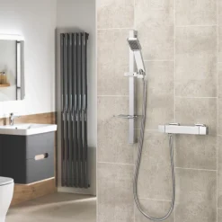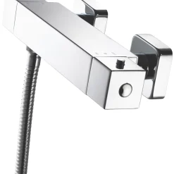 Contemporary thermostatic mixer shower with cool-touch valve and temperature override button for added safety. Suitable for all plumbing systems. Supplied with single-mode handset and adjustable height slider. Square design with a chrome finish.