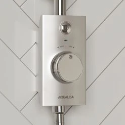 High pressure shower with digital valve technology. Rail-mounted, exposed control unit houses blended water supply and cabling inside an extended slide rail from the ceiling. Features instant, one-touch, push-button controls and easy-glide temperature control. LED indicator shows when the shower is temperature-ready. Adjustable round 90mm shower head with 1 spray pattern. Fast and straightforward installation. Ideal for bathroom upgrades.