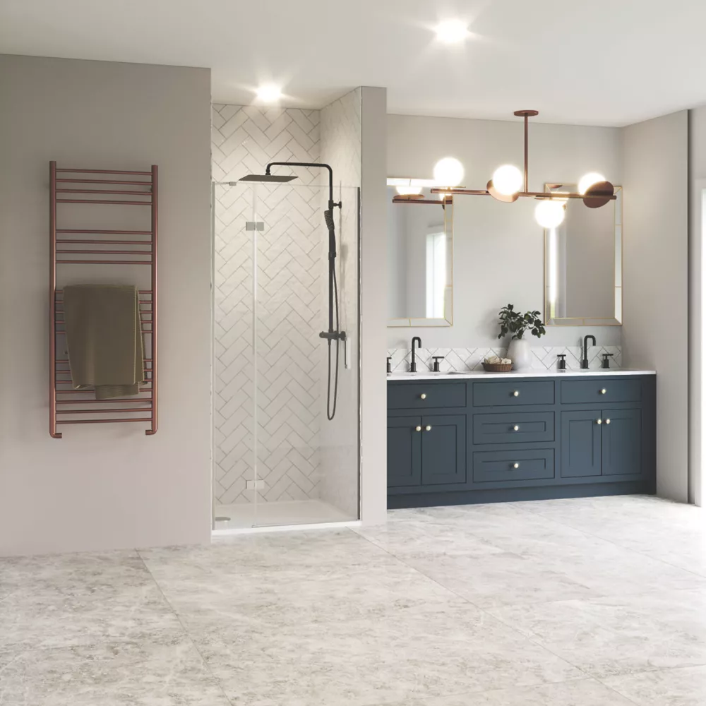 Frameless hinged shower door. Features anticalc-protected toughened glass.