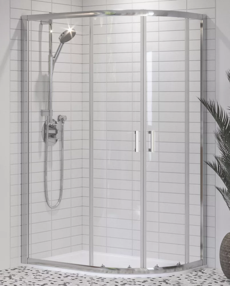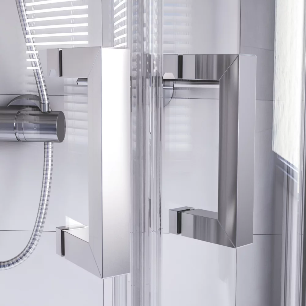 Stylish aluminium frame with toughened safety glass. Features quick-release rollers and an Aquagleam anti-limescale glass coating. Gel magnet closing provides silent closing of the doors.