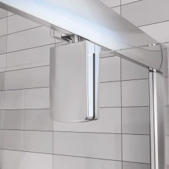 Smooth-opening pivot door enclosure with a stylish design, great for a modern bathroom. Aluminium construction with polished silver-effect finish.