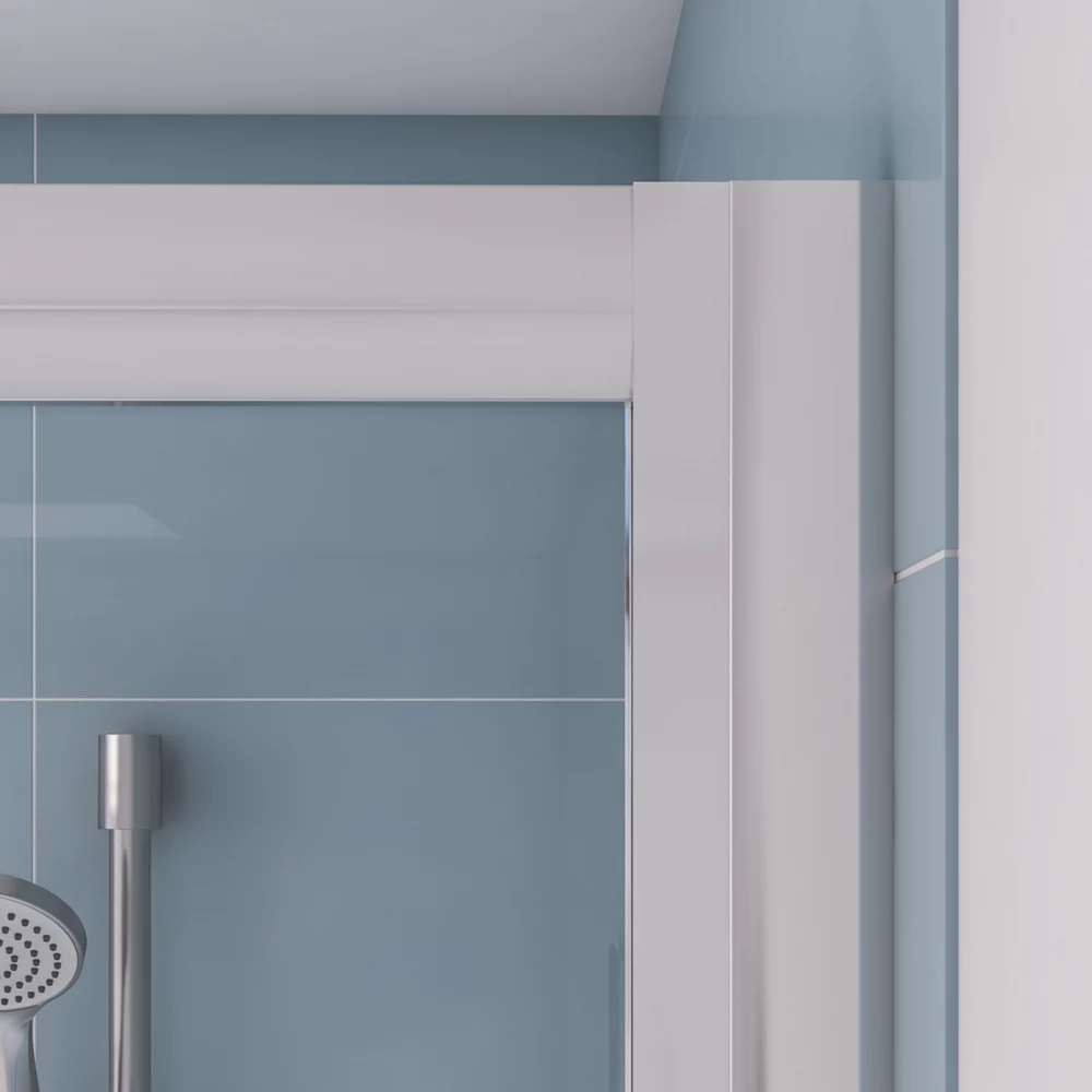 Semi-frameless, polished silver-effect, aluminium enclosure with 2 x sliding doors. Provides a sleek finish whilst maximising space.