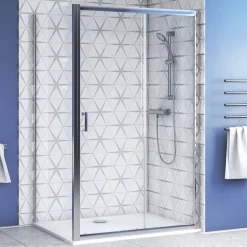 Complete framed shower enclosure kit offering a traditional look. Comprises toughened 6mm safety glass enclosure with anti-calc protection for limescale prevention, reversible sliding shower doors, aluminium frame, slim shower tray and exposed single lever thermostatic shower valve. Features quick release rollers for easy cleaning.