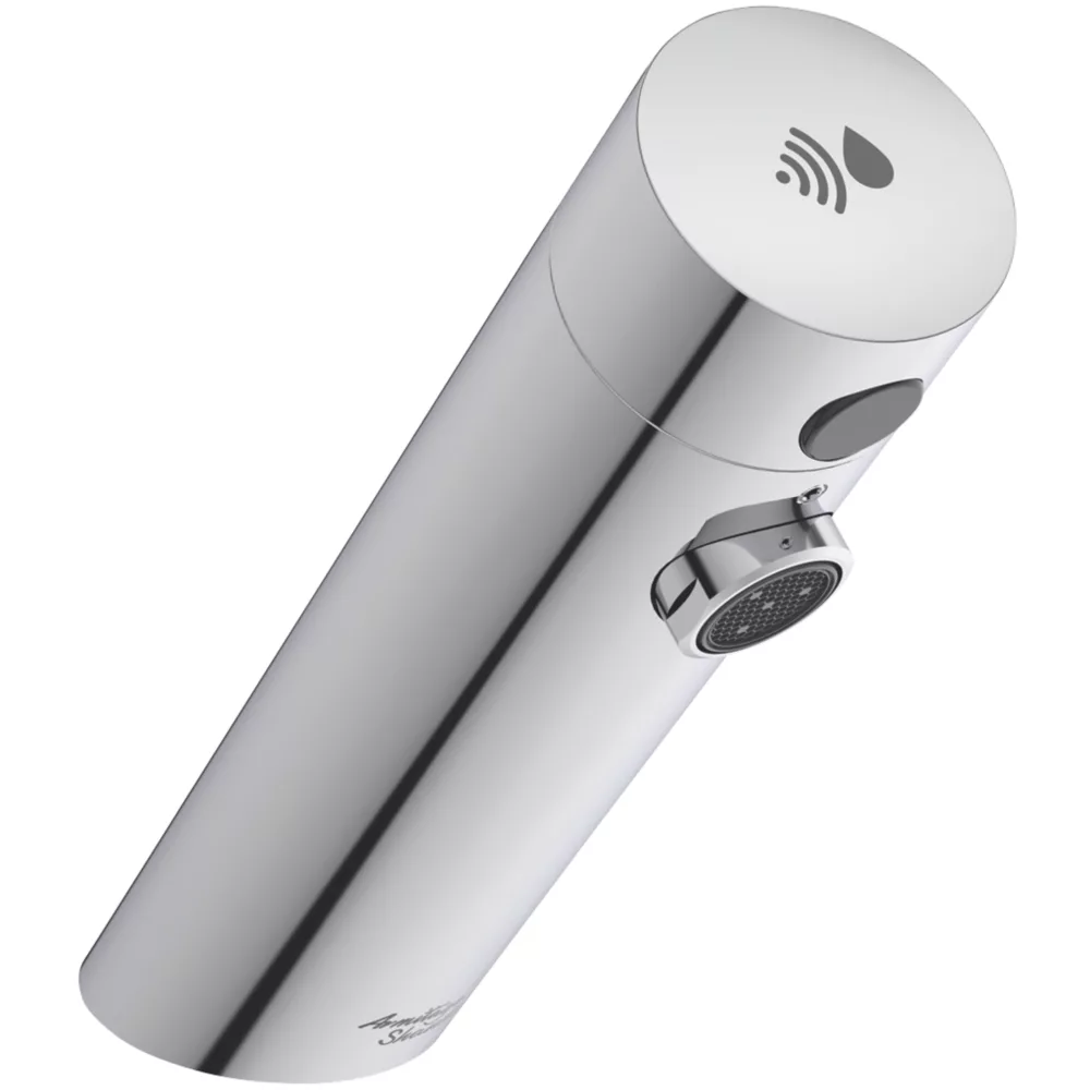 Compact sensor-operated basin tap for no-touch operation. Contemporary design. Brass construction, chrome finish. Battery-operated.