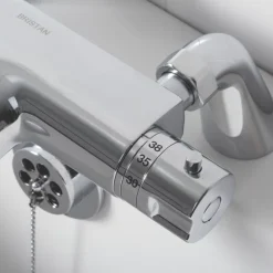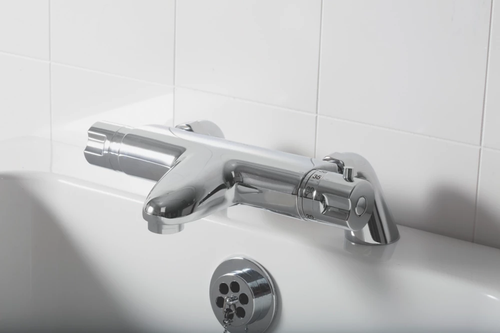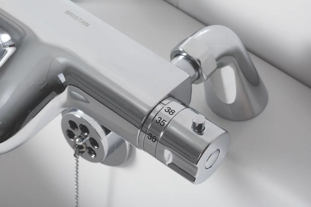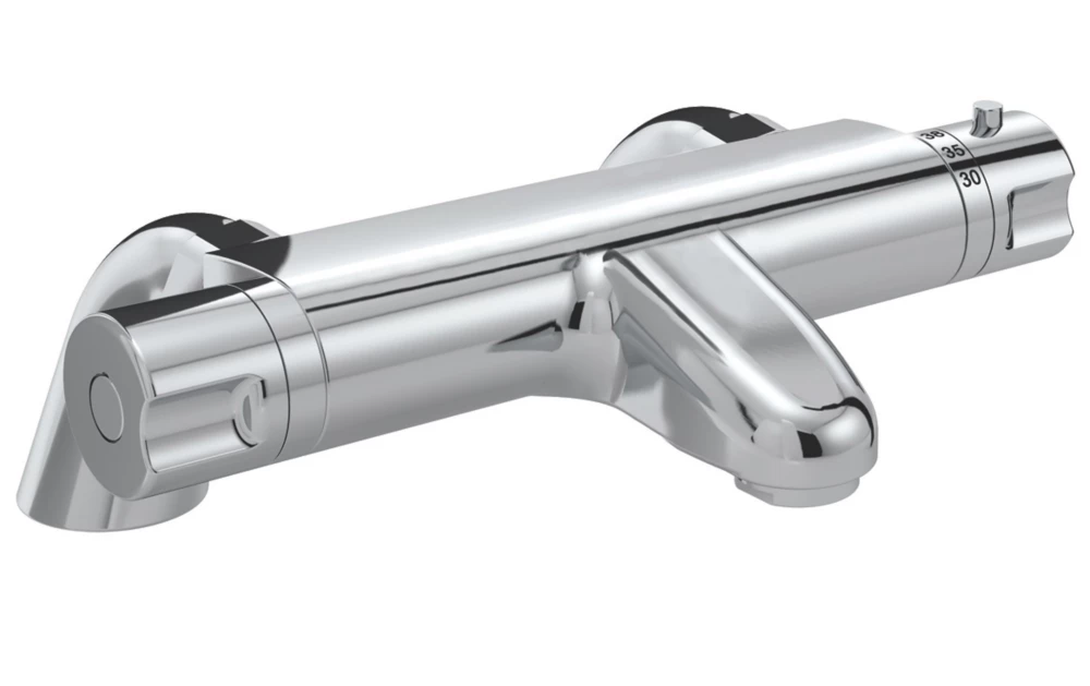 Thermostatic TMV2 bath filler with dual chrome handles, separate controls for water flow and temperature. Pre-set maximum temperature of 38°C with override feature.
