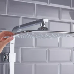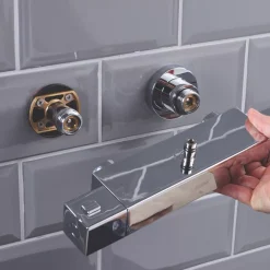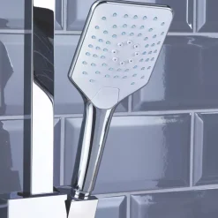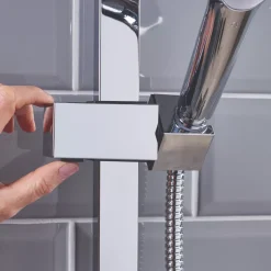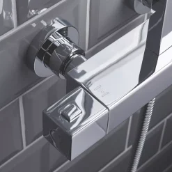 Stylish, soft-angular design. Thermostatic bar mixer shower with Safe Touch technology. Large fixed head and rub-clean multi-function handset. Adjustable height for flexibility. Factory set to a Maximum of 38°C (can be adjusted up to a Maximum of 43°C). Supplied with wall mount.