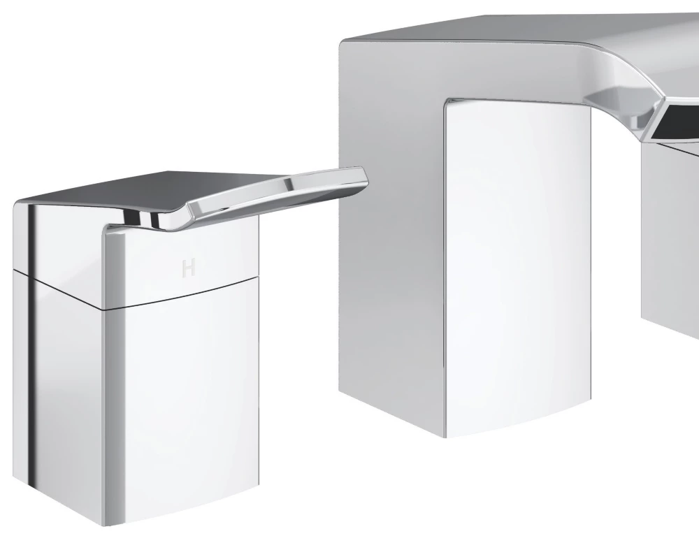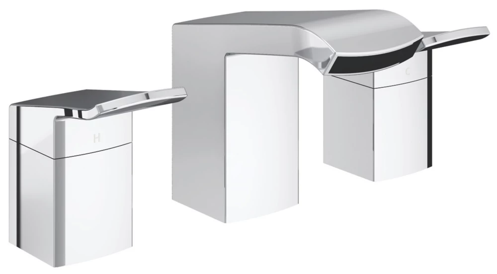 Chrome-plated brass. Features wide spout which creates a cascading affect.