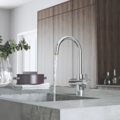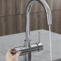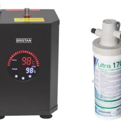 Multifunction tap dispenses cold and hot water. Safety features include push and turn handle for delayed hot water up to 98°C and cool touch spout. Hot water is stored in the tank instead of tap to reduce risk of scalding. Supplied with 5 stage filter cartridge which absorbs chemicals, reduces water hardness and prolongs the life of the tank.
