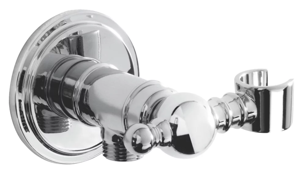 Traditional chrome-plated wall outlet with integral handset holder. Connects shower hose to concealed shower valve.