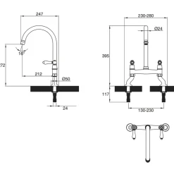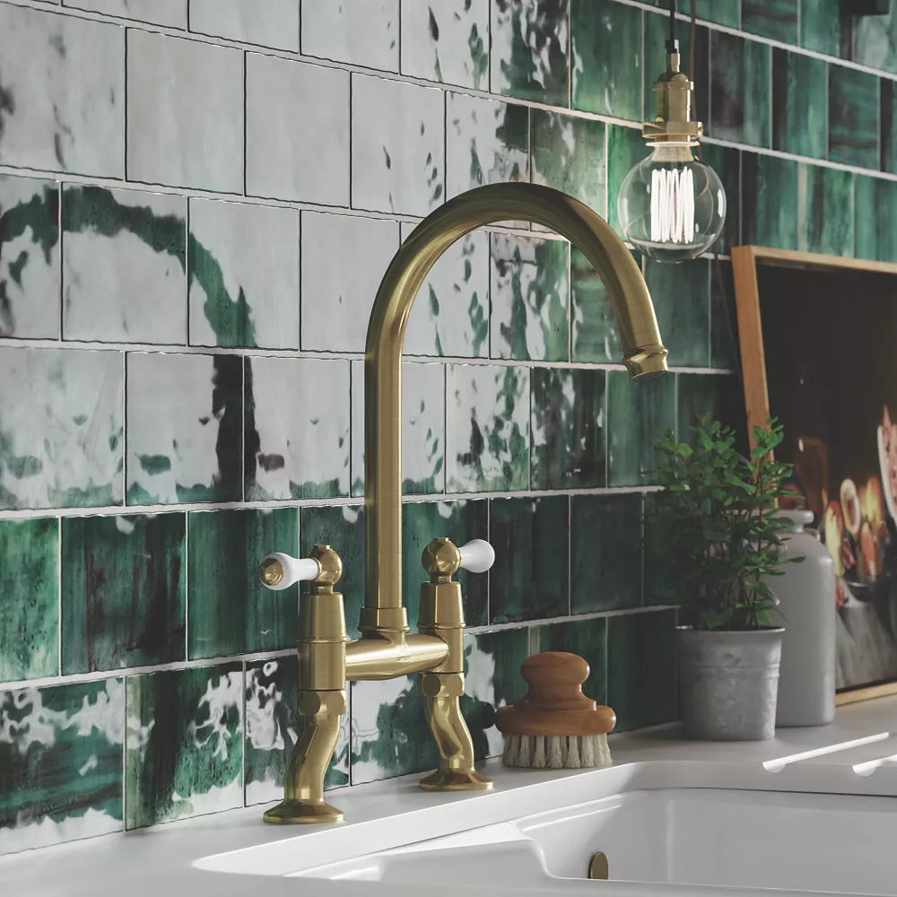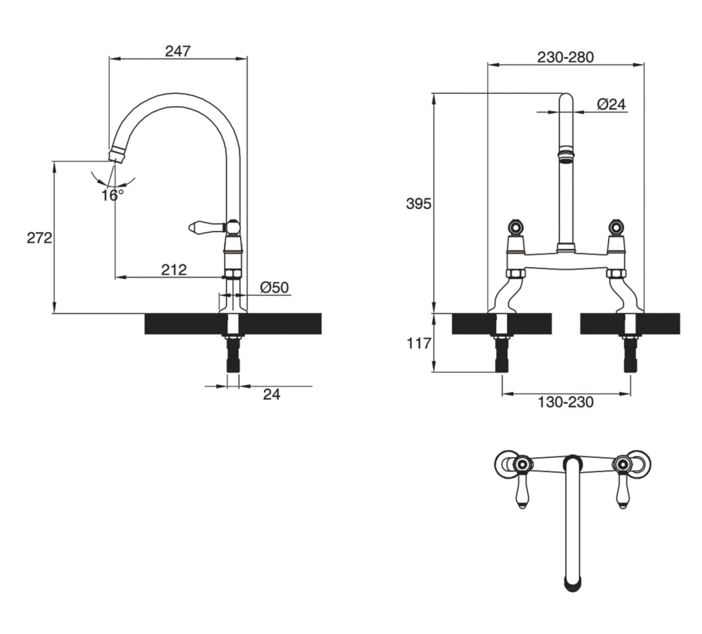 Tall, swan-neck spout with ceramic control levers, ideal for apron front Belfast sinks. Twist and spray aerator provides non-splash, aerated flow or needle-jet spray, ideal for jobs such as rinsing plates, changed with a simple twist of the flange.
