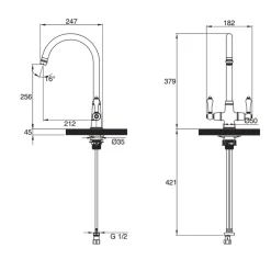 Tall, swan-neck spout with ceramic control levers, ideal for ceramic inset sinks. Twist and spray aerator provides non-splash, aerated water flow or needle-jet spray, ideal for jobs such as rinsing plates, changed with a simple twist of the flange.