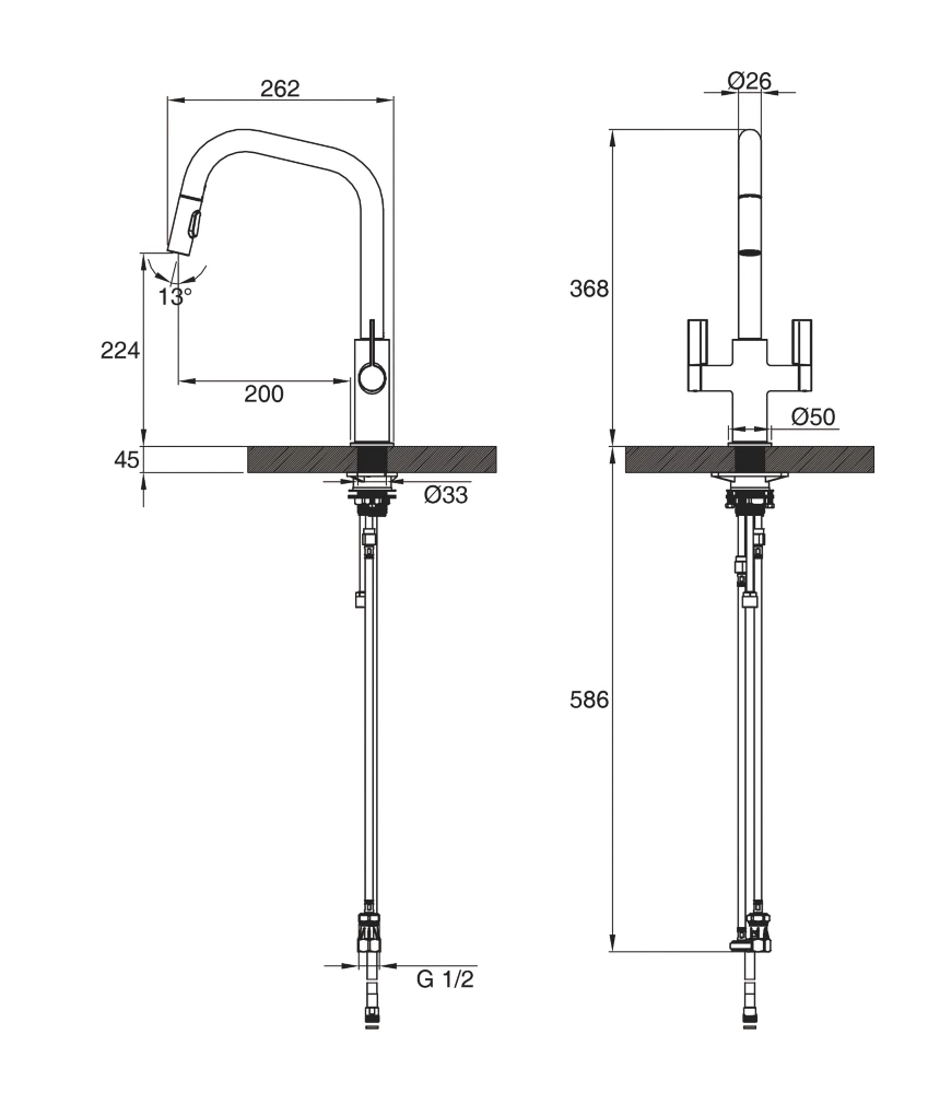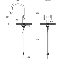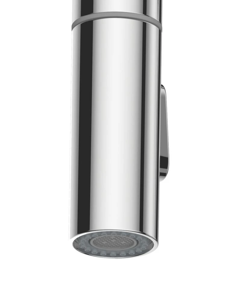 Ultra-modern, pragmatic design. Features easy to operate high-set controls and useful pull-out spout with twin-flow options for various kitchen tasks.