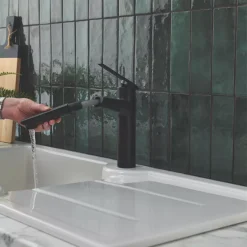 Stylish Swiss design with concealed pull-out spout, extending 40cm for various kitchen tasks. Retracts smoothly.