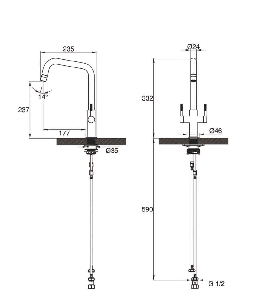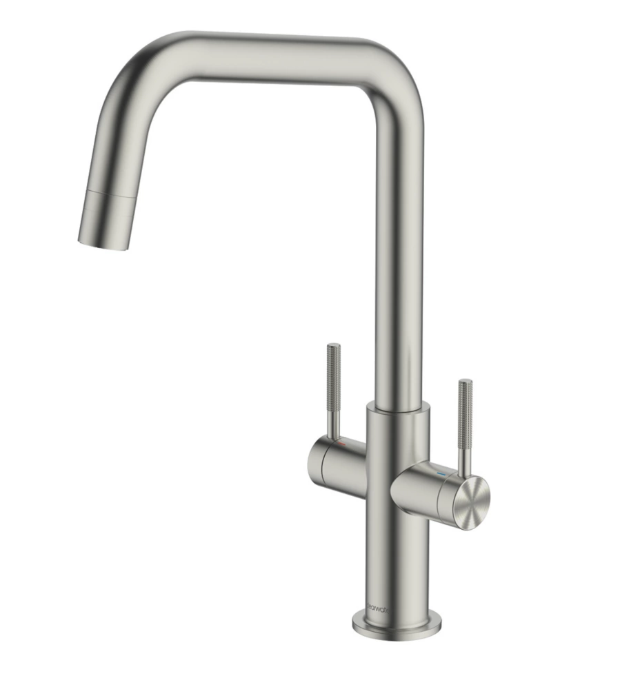 Slimline, urban design with minimalist, high-set knurled controls. Twist and spray aerator provides non-splash, aerated water flow or needle-jet spray, ideal for jobs such as rinsing plates, changed with a simple twist of the flange.