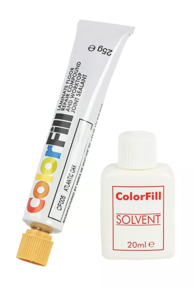 25g ColorFill & 20ml Solvent. Worktop joint sealant and surface repairer. Bonds joints together, eliminating the need for silicone. Colour-matched to worktop for an almost invisible joint. Matches walnut worktop.