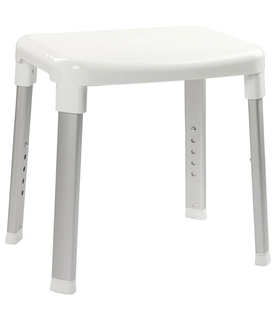 Freestanding shower stool with a large sitting area. Constructed from rust-free materials and is height adjustable. Folds away flat for neat storage when not in use. White finish.