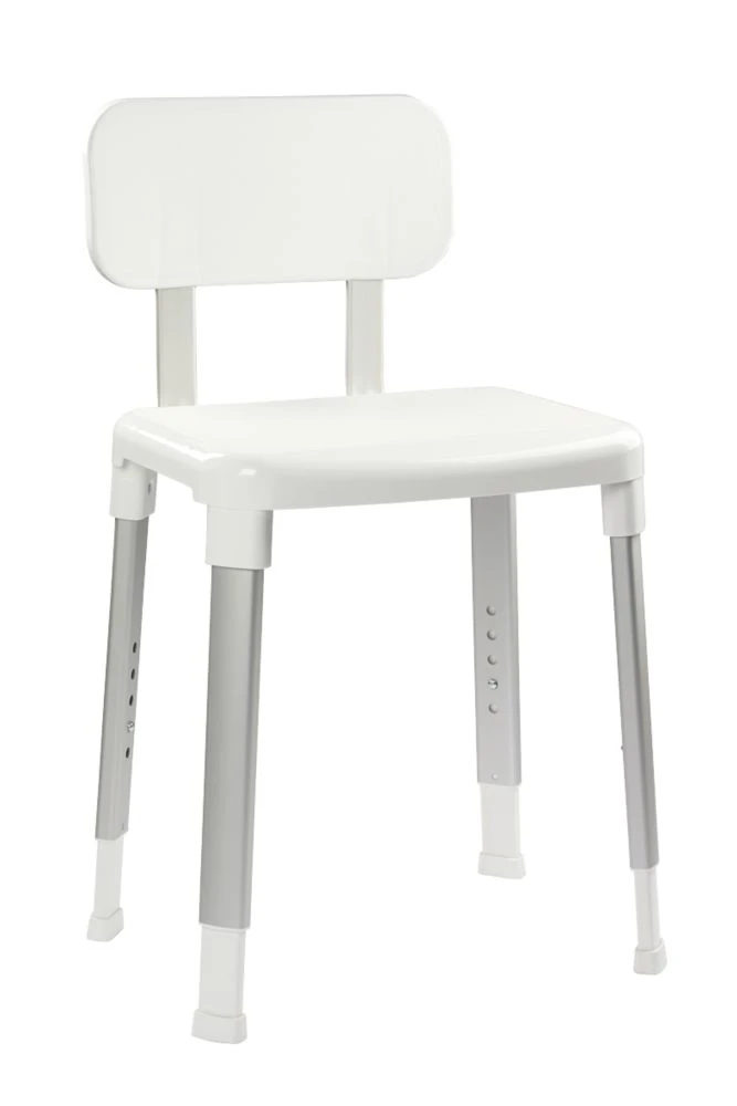 Freestanding shower seat with back and large sitting area. Constructed from rust-free materials and is height adjustable. White finish.