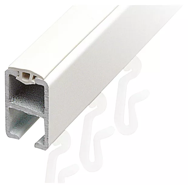 Aluminium. Supplied with 12 x gliders and hooks, 2 x wall supports and fixing kit. Ceiling support not included.