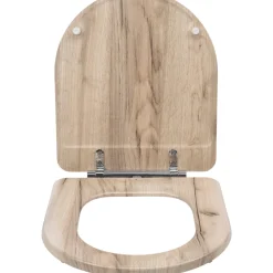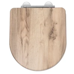 Flexi-Fix toilet seat with high strength, adjustable hinges for a non-slip fitting. Made from long-lasting moulded wood in a D-shaped design. Treated with Hygiene ‘n’ Clean, an anti-bacterial treatment. Easy installation. Simply remove the protective film, position the self-adhesive hinges and tighten into place. Polished hinge covers clip into place for a stylish finish. Quick-release, soft-close. Compatible with any standard UK toilet pan.