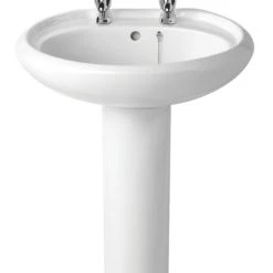 Modern design bathroom suite with close-coupled toilet and a standard seat. Includes a matching 2 tap hole basin and pedestal and an acrylic bath.