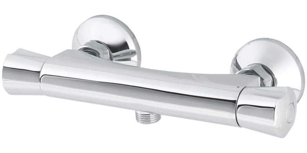 Exposed thermostatic bar valve with chrome-plated brass construction. Separate flow and temperature controls.