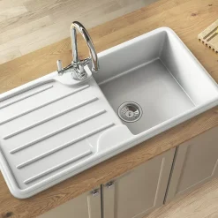 Farmhouse-style kitchen sink, adding a traditional touch to the kitchen. Ideal for multi-taskers and busy kitchens with one large deep basin and a spacious drainer. The material is also extremely impact-resistant without being so hard that it damages cups, plates and pans.