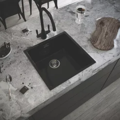 Pressed material ‘Comite Sink’ with a toughened outer layer that provides great strength and can withstand high temperatures. Feels and appears as the highest-grade ceramic, but without all the disadvantages. Scratch-resistant, whilst keeping the same visual appeal as the best cast materials. The material also has a high degree of impact resistance without having too great a hardness that it damages cups, plates and pans. Engineered, as opposed to cast, to create sharper, cleaner edges allowing for more design freedom.