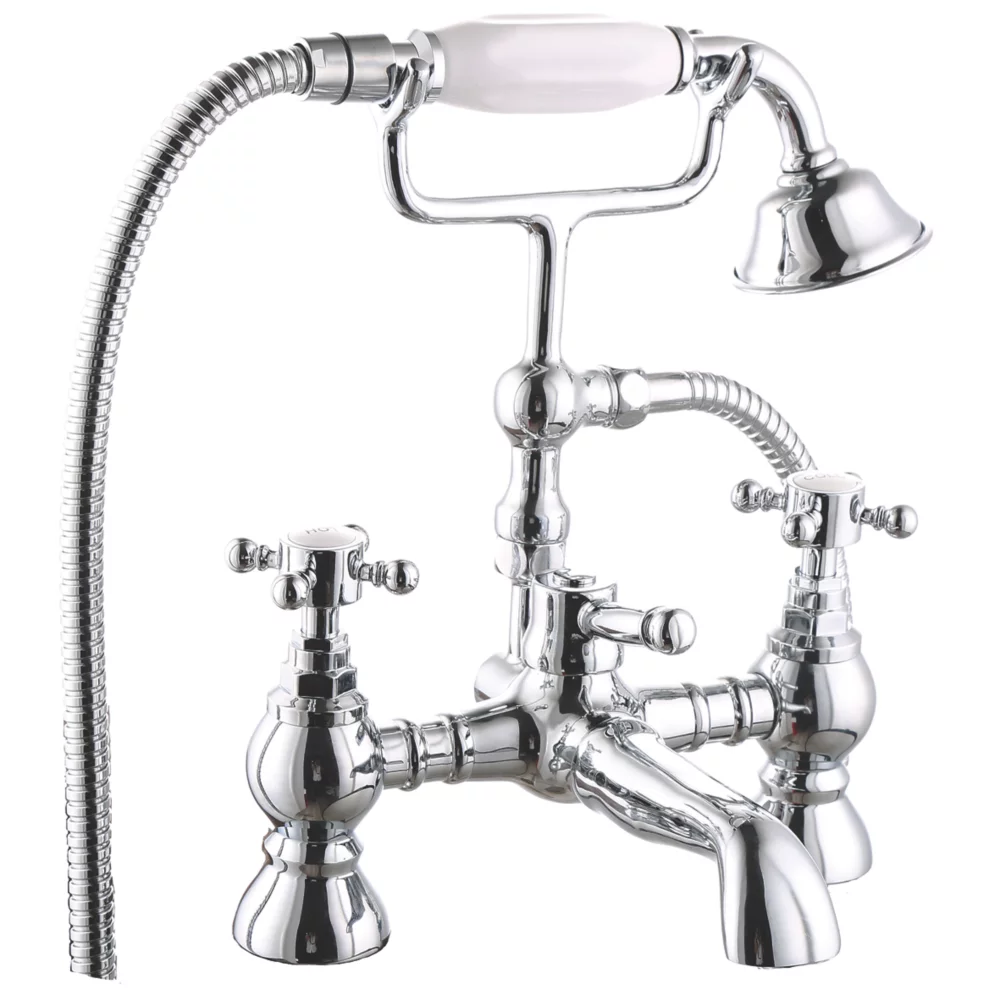 Solid brass construction with polished chrome finish. Includes shower kit.