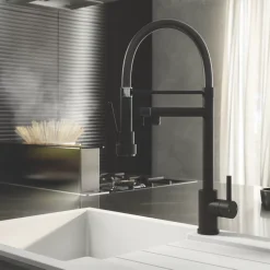 Stylish mixer tap with single-lever operation for ease of use. Features spout for filling bowls and saucepans and handset on flexible, gel-style hose for rinsing.