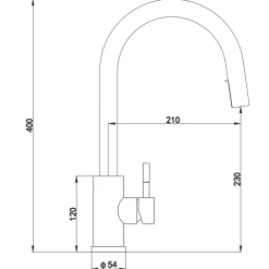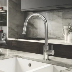 Contemporary dual-function tap. Features button press for switching between normal and shower sprays, all concealed within spout for a clean look.