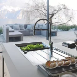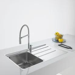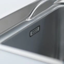 Sleek stainless steel sink with large bowl. Reversible drainer gives the freedom to position the sink to provide either a left or right-handed drainer. Hygienic overflow with ultra-slim edge. Supplied with basket strainer wastes.