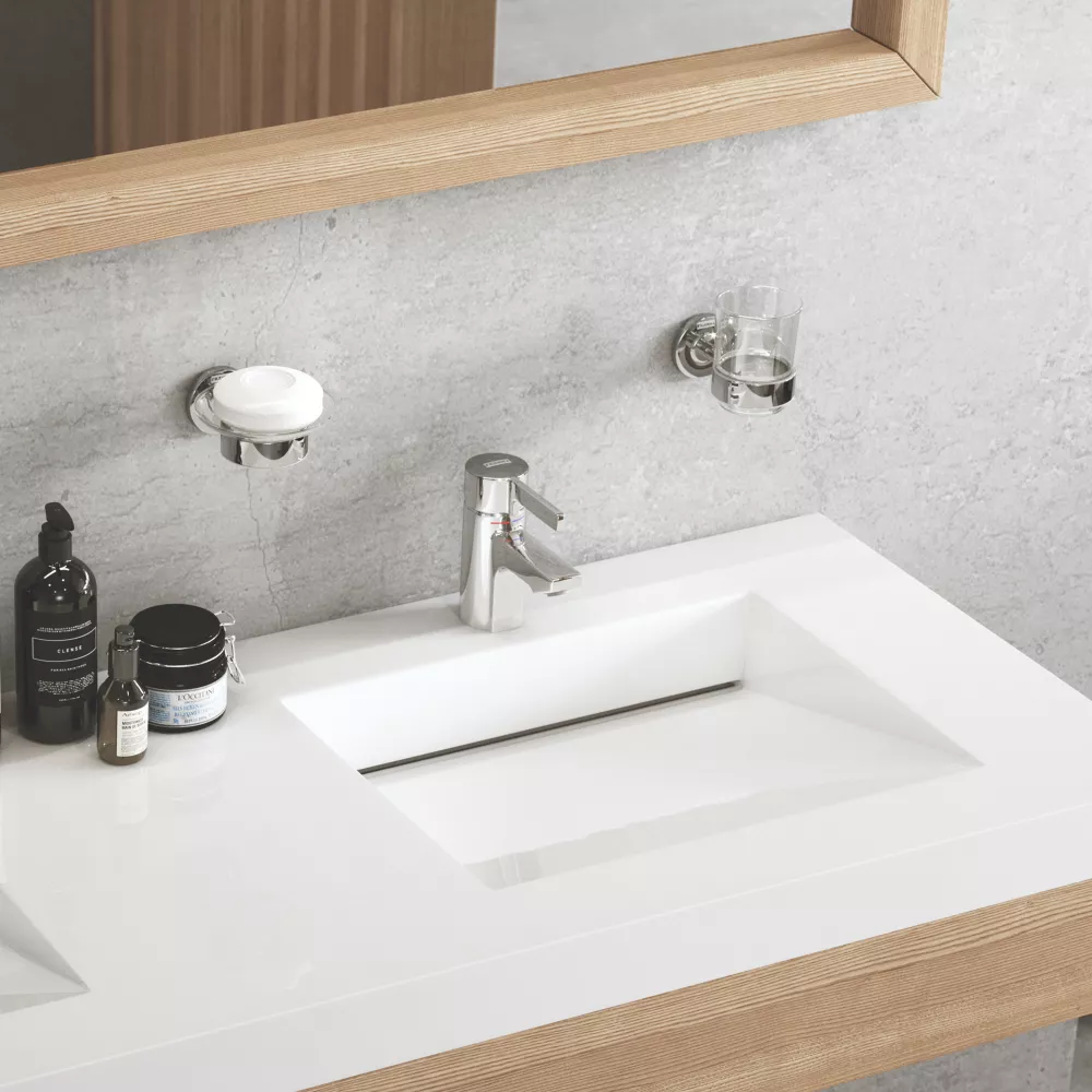 Highly polished stainless steel construction. Round, detachable cover conceals screws when mounted on wall. Easy to install and clean. Contemporary design. Supplied with glass tumbler.