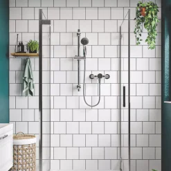 Single outlet, manually operated mixer valve with a single handle that turns the shower on and sequentially controls the water temperature. Features single-mode, rub-clean handset in a push-button holder for variable height adjustment and stainless steel hose and rail. Quality all-chrome finish. Suitable for all approved UK water systems operating between 0.15-5 bar pressure.