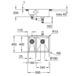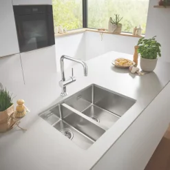 Sleek and minimal style without compromising practicality. Designed to be undermounted (right-hand mounting) beneath a worktop and is constructed from top quality materials to a high finish. Main bowl has a depth of 200mm making it extremely practical, comfortably fitting large pans. Minimalist square-shaped overflow and Whisper insulation rubber pad on the underside to reduce noise from running water. Made from GROHE StarLight AISI 304 grade stainless steel with a brushed finish to make the surface less porous and easier to keep clean meaning it will look good for longer. Choose between a classic topmount installation with 1mm profile, a flush-mount installation with a 1.5mm recess perfect for fitting flush to the worktop, or a sleek undermount installation that sits under the worktop.