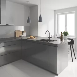 Clean and flexible. Simple to install due to easy installation system. Features C-shaped high spout that can be fixed or limited to turn either 150˚or 360˚. Maintains water and temperature control. Velvet Black scratch-resistant finish.