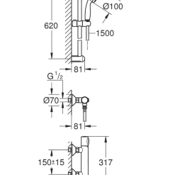 Thermostatic cartridge with wax thermo-element ensures instant water flow at desired temperature, keeping it constant irrespective of fluctuations in water pressure or supply. SafeStop limits water temperature to 38°C, with optional increase to 43°C, to reduce risk of scalding. Features ShockProof shower head with ShockProof silicone rim for damage protection.