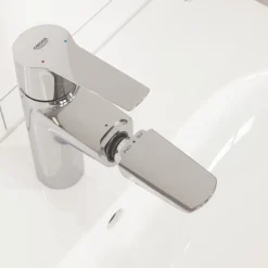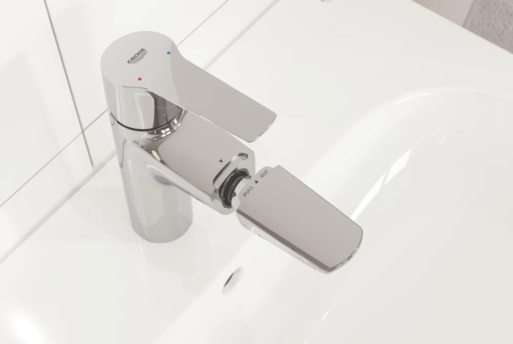 Single-lever, M-size basin tap with contemporary slim profile, designed for single-hole installation. Features retractable pull-out spout with magnetic docking system, ideal for cleaning the basin or rinsing hair. Push-open pop-up waste can be opened and closed with a light fingertip push. SilkMove ceramic cartridge offers durable, precise volume and temperature control via the solid metal lever. Integrated temperature limiter saves energy, while EcoJoy technology reduces water consumption to 5.7Ltr/min without compromising on performance. Zero isolated inner waterways ensure that water is lead and nickel-free within the tap. Hardwearing StarLight chrome finish.
