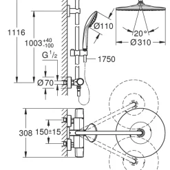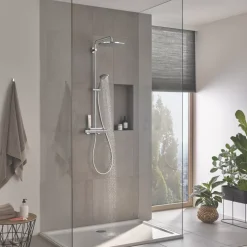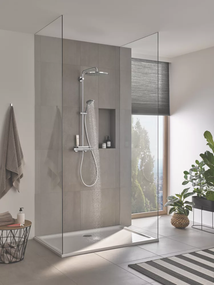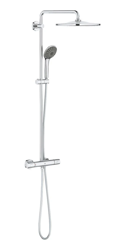 Stylish system with ergonomic metal handles. Features SafeStop, limiting water temperature at 38˚C or up to a maximum of 43˚C (SafeStop Plus) and TurboStat to maintain desired temperature, even if supply fluctuates. CoolTouch ensures thermostat surface is never too hot to handle. Offers Aquadimmer function, controlling water volume and flow of water between head or hand showers. DreamSpray ensures even flow of water from every nozzle with SpeedClean keeping them free of dirt and limescale. Head shower with swivelable, horizontal 450mm projection shower arm offers soothing rain spray and hand shower offers 3 spray zones for varying powers. Easy to install.
