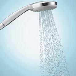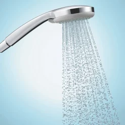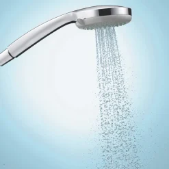 Thermostatic temperature control with safety lock at 40°C protects against scalding-hot water. Ecostop button limits the water consumption to 10Ltr/min at 3 bar. Easily remove limescale from the flexible silicon nozzles from the 3 spray handset with QuickClean technology.