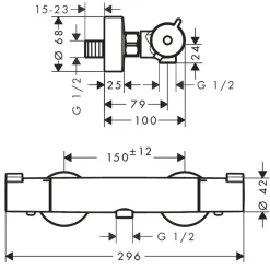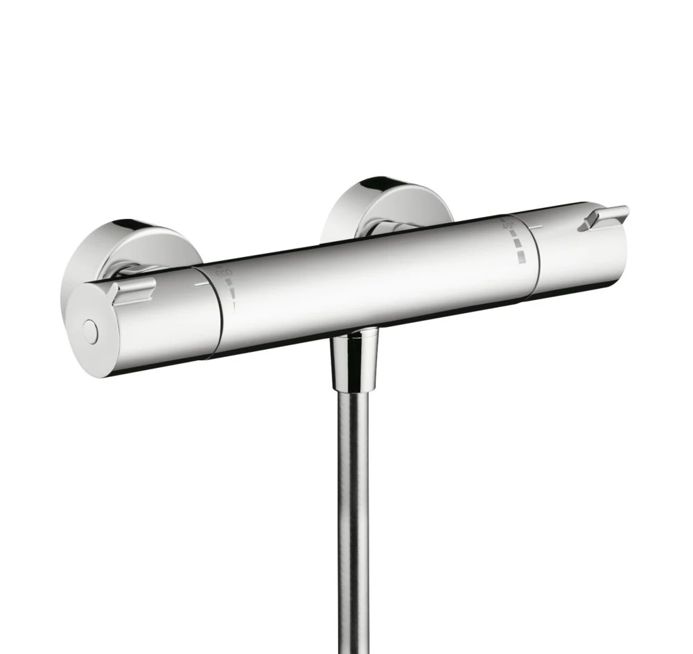 Easy to install exposed shower mixer. Water volume and temperature can be easily set using the ergonomic handles. Thermostatic mixer keeps water at required temperature and prevents unintentional adjustment, as hot water will only be released if SafetyStop button is pressed. Reacts to pressure fluctuations in an instant to protect from excessively hot or cold water. Optional thermostat safety stop prevents unwanted hot water above 40°C. Maximum water flow: 10 Ltr/min with Eco handle position. Pressing EcoStop button releases full water volume. Can be fitted on to existing water outlet using supplied S-connections (bore hole gauge: 150mm, +/-12 mm).