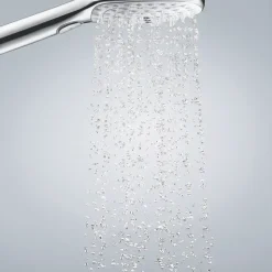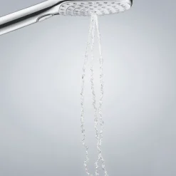 Modern design shower head with 3 spray patterns. Features Hansgrohe Quickclean and EcoSmart technology. Suitable for high pressure systems.