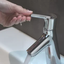 Built-in flow regulator with EcoSmart technology for saving water. Ceramic cartridge for long life use offers a stable water flow. Limescale deposits can be easily removed from the smooth surface and the aerator fingertips. Lever at back of tap controls pop-up waste. Chrome resists impacts and resists tarnishing.